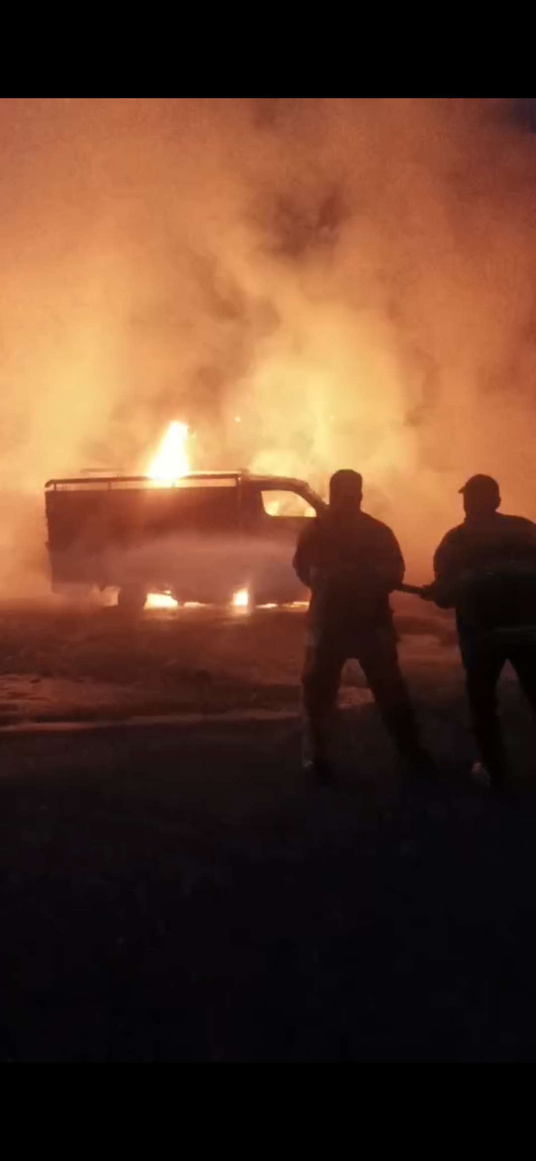 Dalam hitungan menit, sirene mobil pemadam membelah malam. Di lokasi kejadian, petugas langsung bekerja bajibaku. Namun api tidak mudah ditundukkan. Percikan bahan bakar membuat nyala api tiba-tiba membesar setiap kali air menyentuh tubuh kendaraan yang masih menyimpan sisa BBM entah dari mana dan dibawa kemana dan untuk apa.