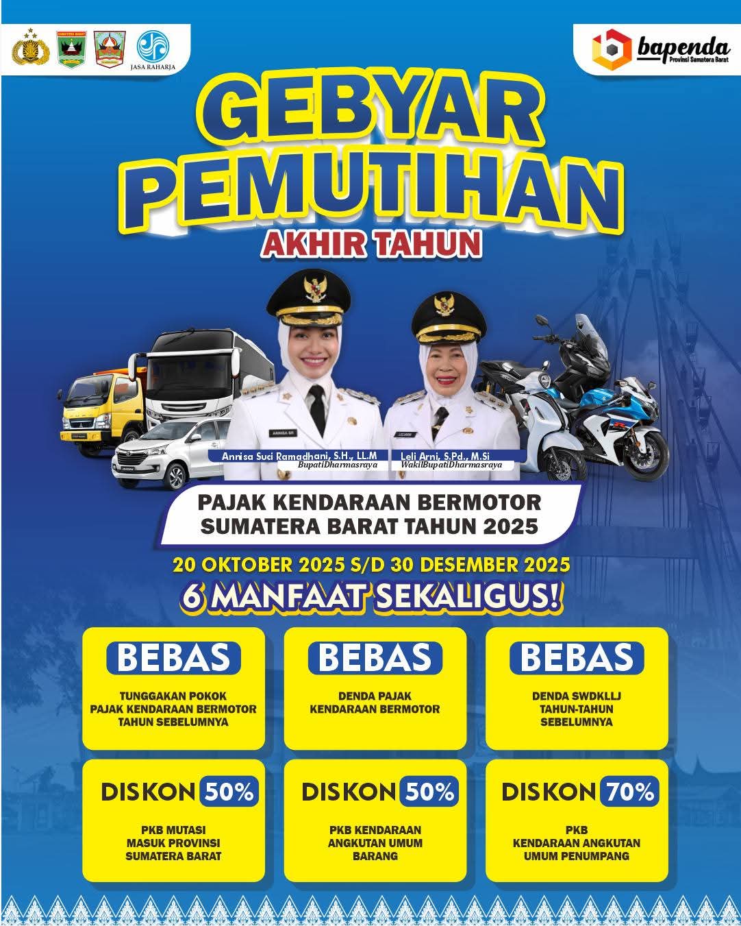 Dharmasraya – Bupati Annisa Suci Ramadhani, mengimbau seluruh masyarakat Dharmasraya untuk memanfaatkan program Gebyar Pemutihan Pajak Kendaraan Bermotor (PKB) Akhir Tahun 2025 yang digelar Pemerintah Provinsi Sumatera Barat.