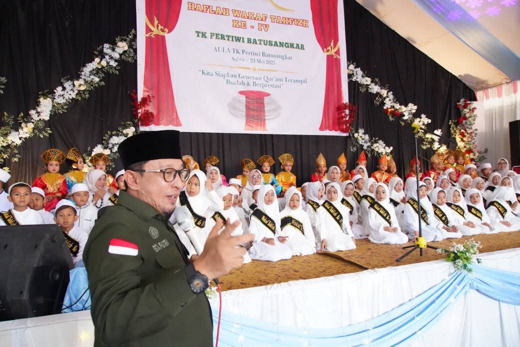 Batusangkar – Bupati Tanah Datar Eka Putra, menyambut baik terlaksananya Haflah Wisuda Tahfiz ke IV TK Pertiwi Batusangkar, yang digelar di Aula setempat, Sabtu (24/5).