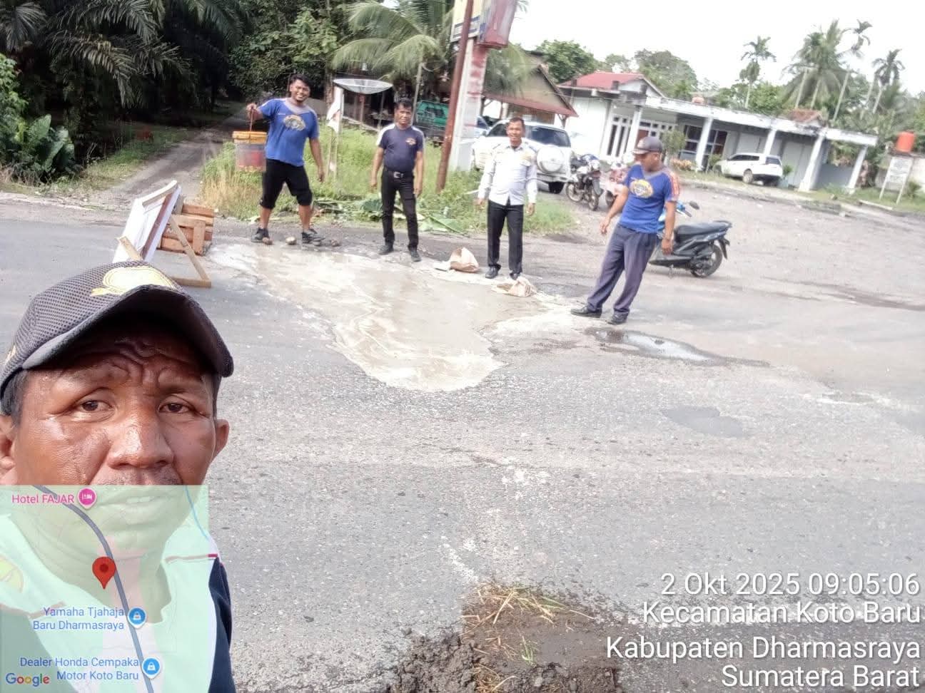 Dharmasraya – Dinas Perhubungan (Dishub) Kabupaten Dharmasraya mengerahkan anggotanya untuk menambal lubang yang membahayakan penumpang pada titik Jalan Lintas Sumatera Palo Padang, Nagari Koto Padang, Kecamatan Koto Baru, Kamis (02/10/2025). Penambalan dilakukan menggunakan material semen dan pasir sebagai solusi sementara.