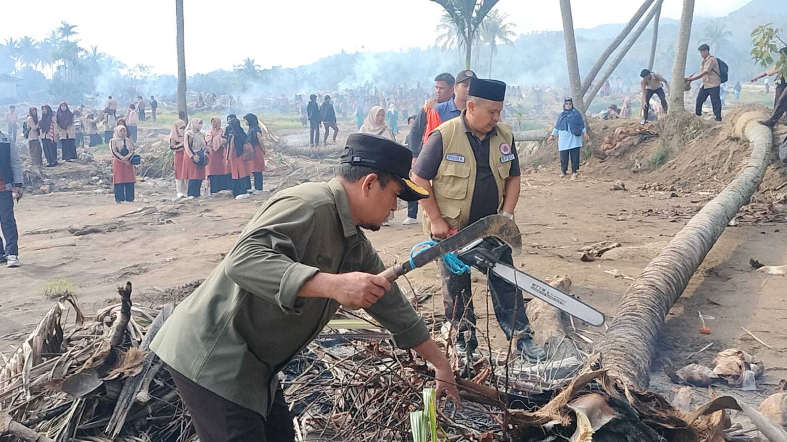 Kayu balok dan pohon kelapa yang berserakan di area persawahan dipotong menggunakan chainsaw, lalu disisihkan ke pinggir lahan. Sebagian material kayu yang tidak dapat dimanfaatkan dibakar secara terkendali. Sedangkan gundukan tanah bercampur pasir diratakan dan diangkut ke lokasi lain.