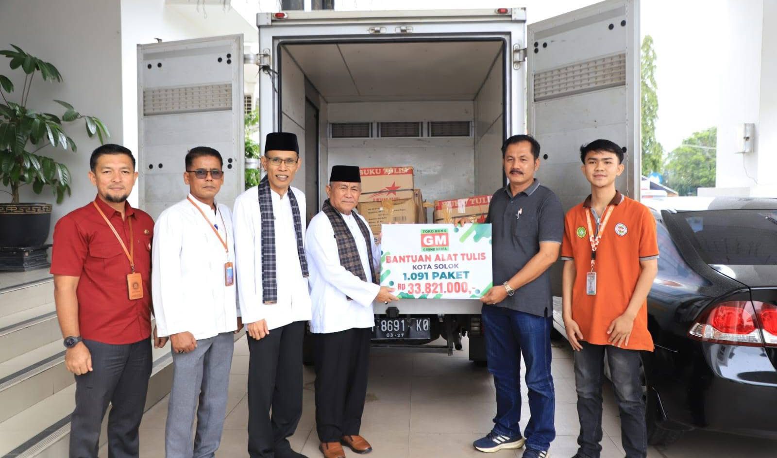 Kota Solok — Wakil Wali Kota Solok, H. Suryadi Nurdal, menerima bantuan buku dan alat tulis yang diserahkan langsung oleh General Manager Grandmedia Solok, Haris, di Lobby Balaikota Solok, Kamis (11/12).