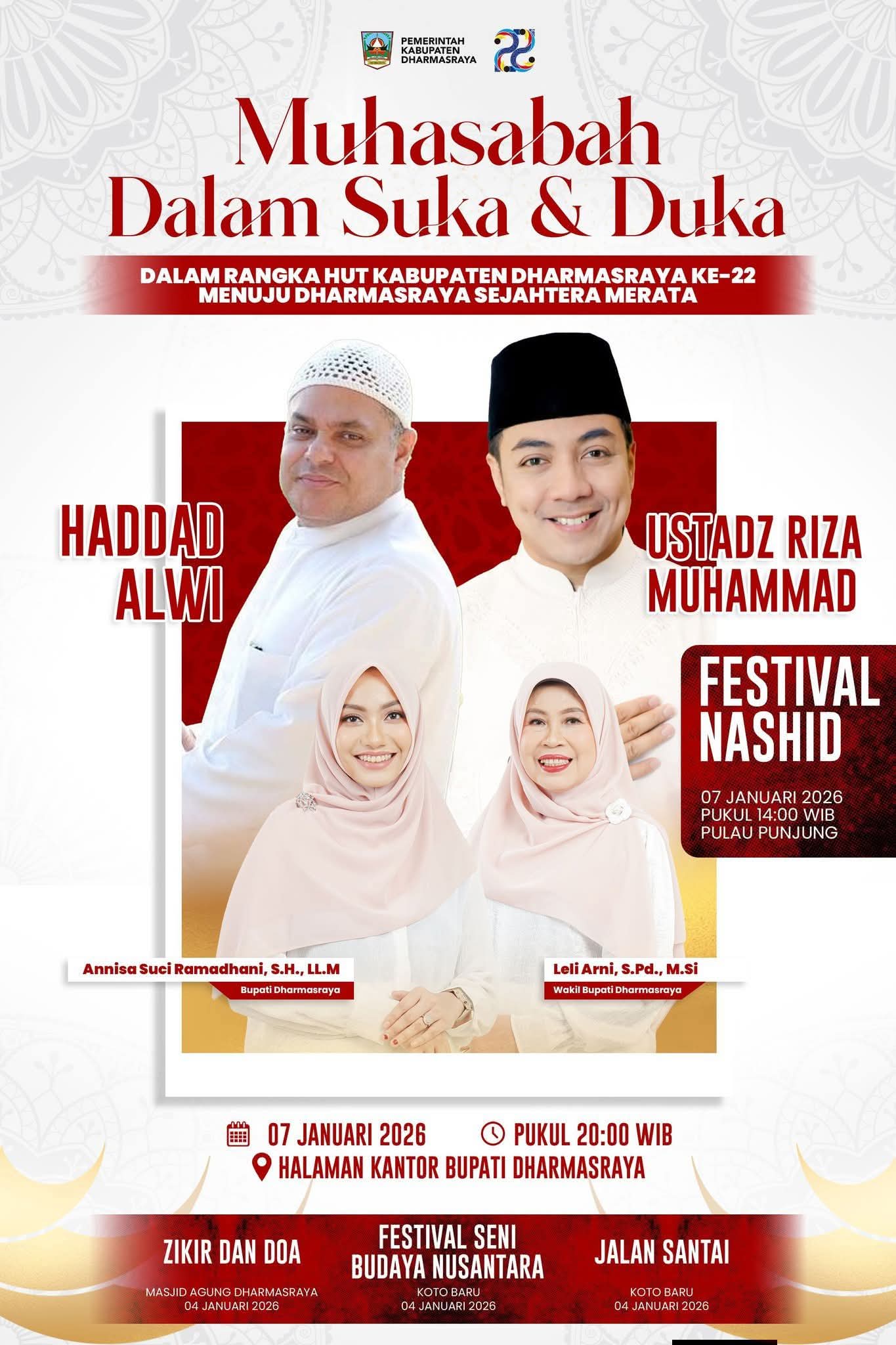 Pemkab Dharmasraya menilai perayaan yang sederhana namun bermakna lebih relevan dibandingkan pesta rakyat di tengah situasi duka dan proses pemulihan.Acara muhasabah akan menghadirkan penyanyi religi Haddad Alwi serta penceramah Ustadz Riza Muhammad. Keduanya dihadirkan untuk menguatkan spiritualitas sekaligus membangun optimisme kolektif masyarakat.