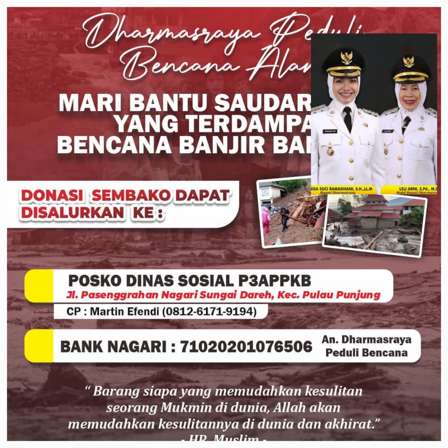 Tak hanya bantuan barang, Pemkab Dharmasraya juga membuka rekening khusus di Bank Nagari, nomor 71020201076506 atas nama Dharmasraya Peduli Bencana Alam. Rekening ini menjadi wadah bagi masyarakat yang ingin berdonasi secara cepat dan aman.