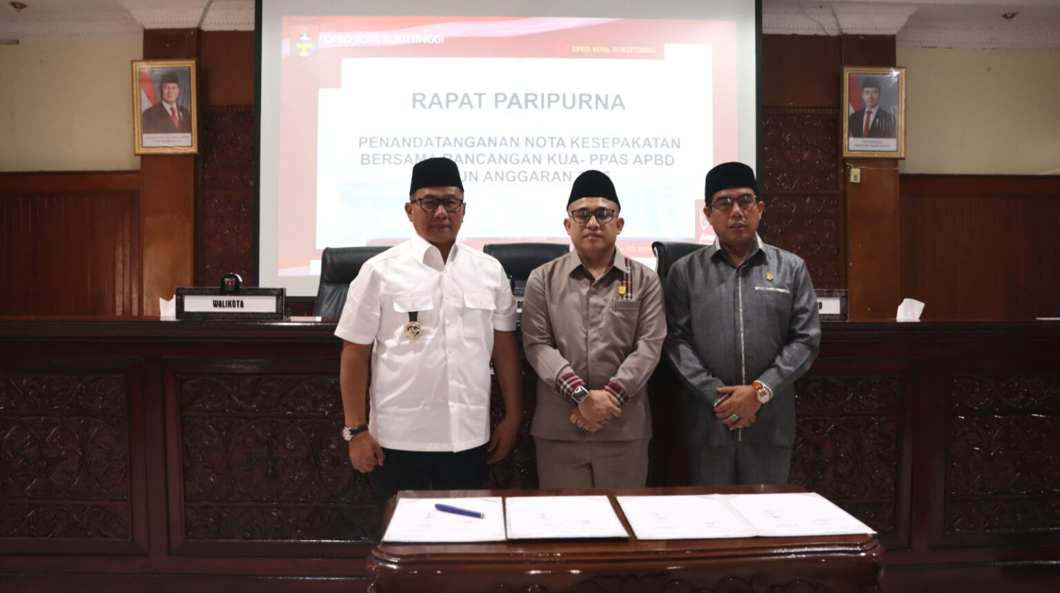 Bukittinggi — Pemerintah Kota Bukittinggi bersama DPRD Kota Bukittinggi resmi menandatangani Nota Kesepakatan Kebijakan Umum Anggaran (KUA) dan Perubahan Prioritas Plafon Anggaran Sementara (PPAS) Tahun Anggaran 2026 dalam rapat paripurna yang digelar di gedung DPRD Kota Bukittinggi, Senin (3/11)