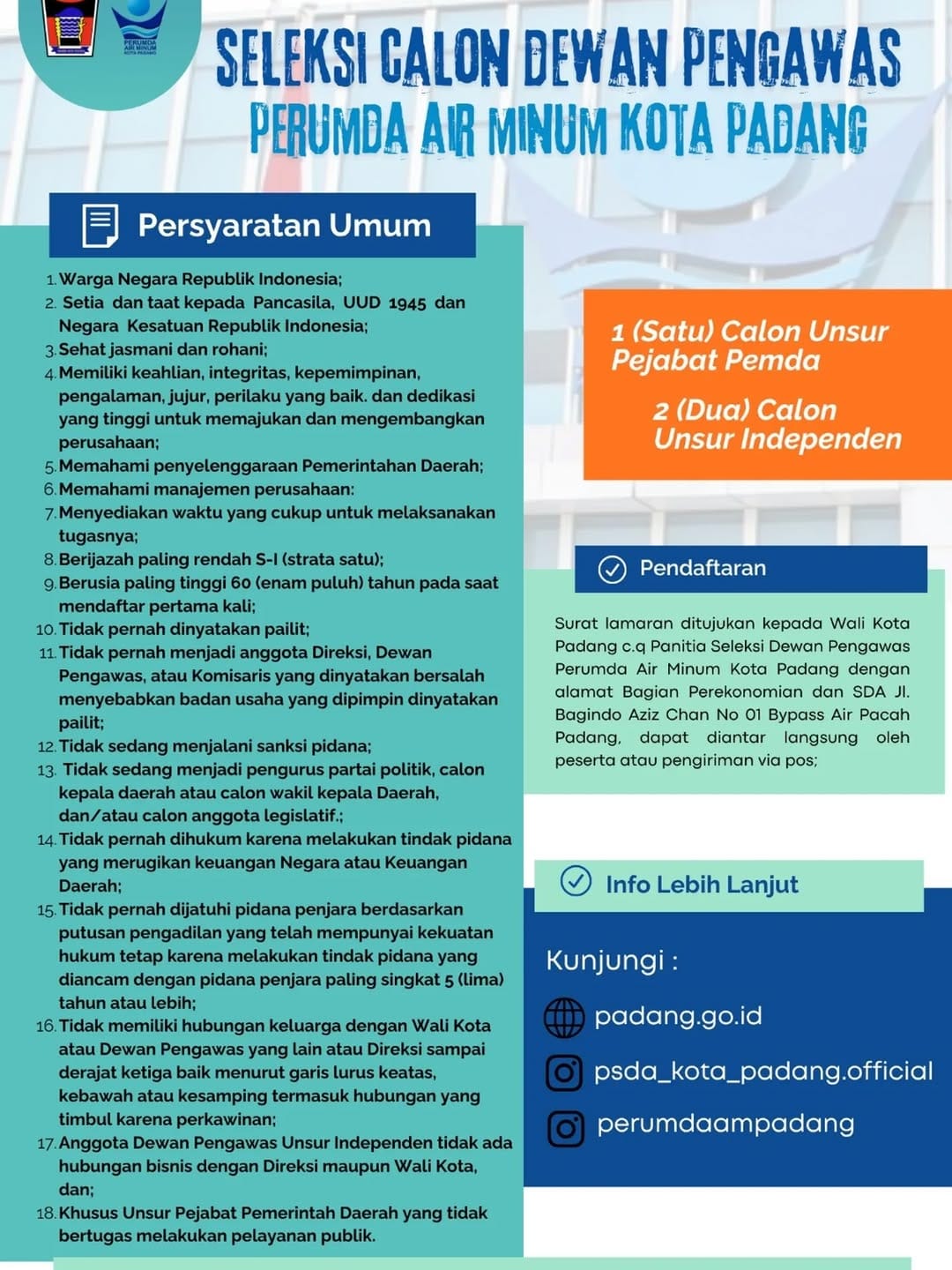 Padang — Pemerintah Kota (Pemko) Padang membuka kesempatan bagi para profesional terbaik untuk bergabung sebagai Calon Dewan Pengawas Perusahaan Umum Daerah (Perumda) Air Minum Kota Padang, (01/10)