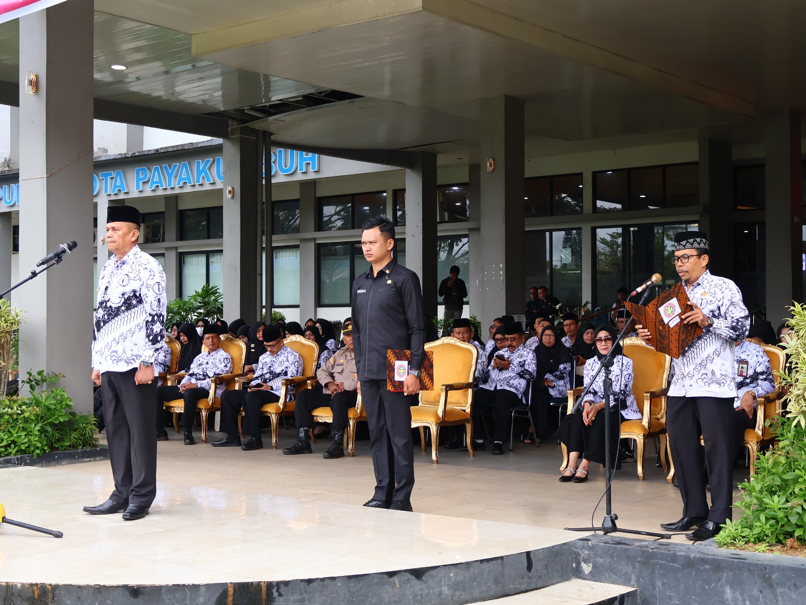 Meski hujan mengguyur sejak pagi, ratusan guru tetap melaksanakan upacara bersama Wakil Wali Kota Payakumbuh, Elzadaswarman, di halaman Balai Kota Payakumbuh, Selasa (25/11/2025).