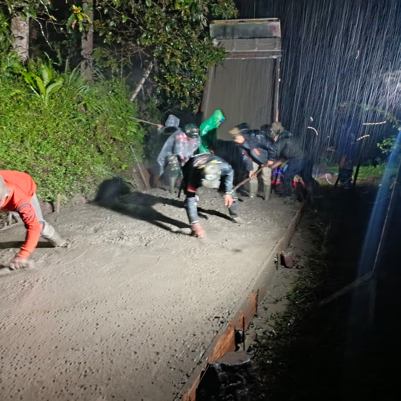 Meskipun diguyur hujan, semangat gotong royong tak surut. Pengecoran jalan dilakukan pada titik 1.200 meter ke arah 1.100 meter, dengan capaian hasil pekerjaan malam itu kurang lebih 90 meter. Satgas TMMD dan masyarakat bahu-membahu bekerja siang dan malam untuk mempercepat pencapaian sasaran fisik pengecoran jalan hingga total 1.500 meter.