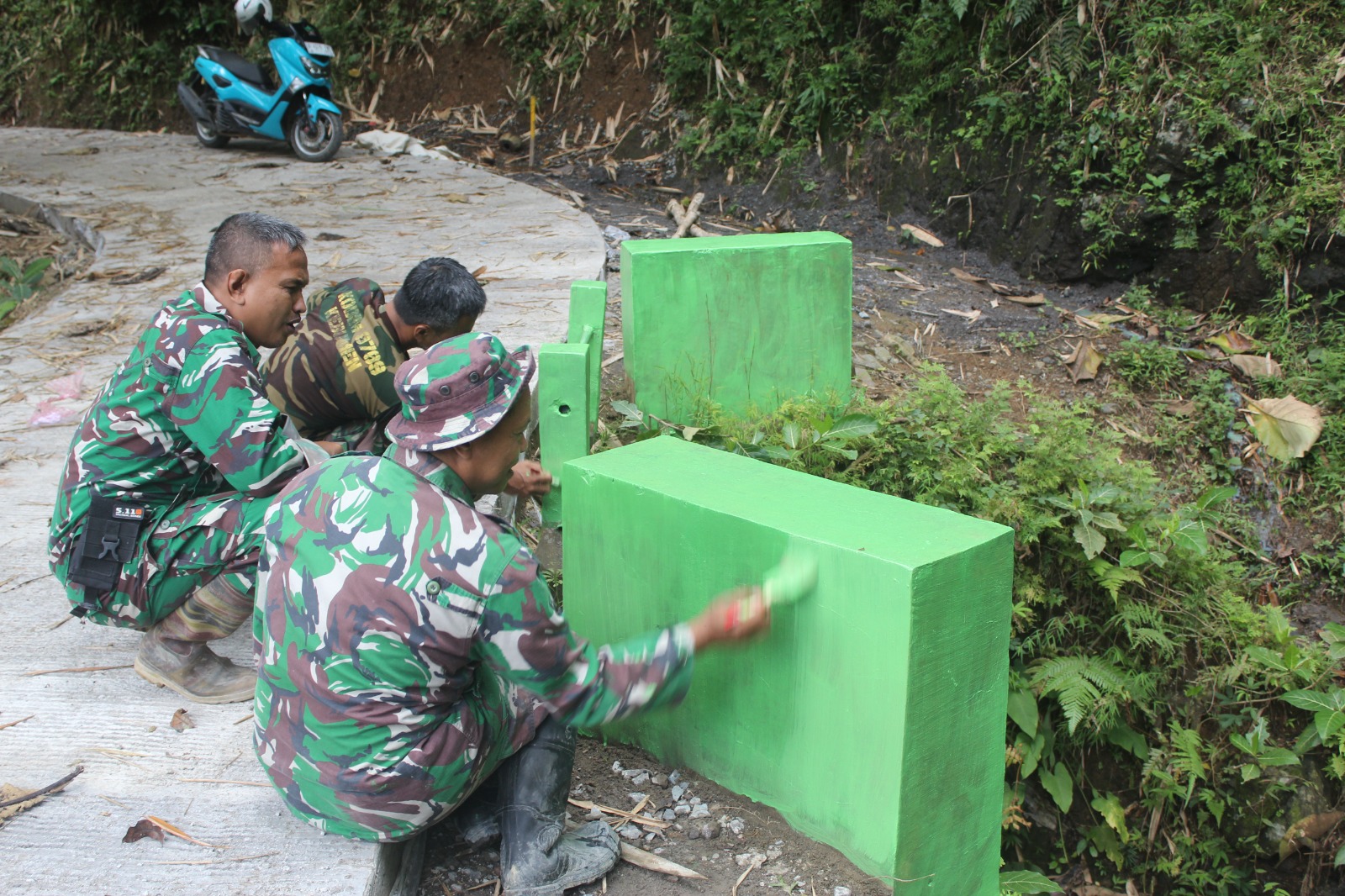 Setelah terpasang kokoh, sentuhan akhir pun diberikan. Dengan kuas dan cat di tangan, anggota Satgas bersama warga mengecat plat duiker jembatan dengan warna hijau—warna yang melambangkan kesegaran, pertumbuhan, dan kehidupan. Semburat hijau itu bukan hanya memperindah tampilan, tetapi juga menjadi lapisan pelindung dari karat dan cuaca, agar jembatan kecil ini tahan menghadapi musim demi musim.