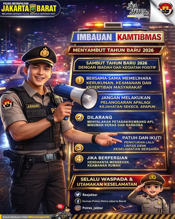 Jakarta Barat — Polres Metro Jakarta Barat mengimbau masyarakat untuk tidak merayakan malam pergantian Tahun Baru 2026 dengan membakar petasan maupun kembang api.