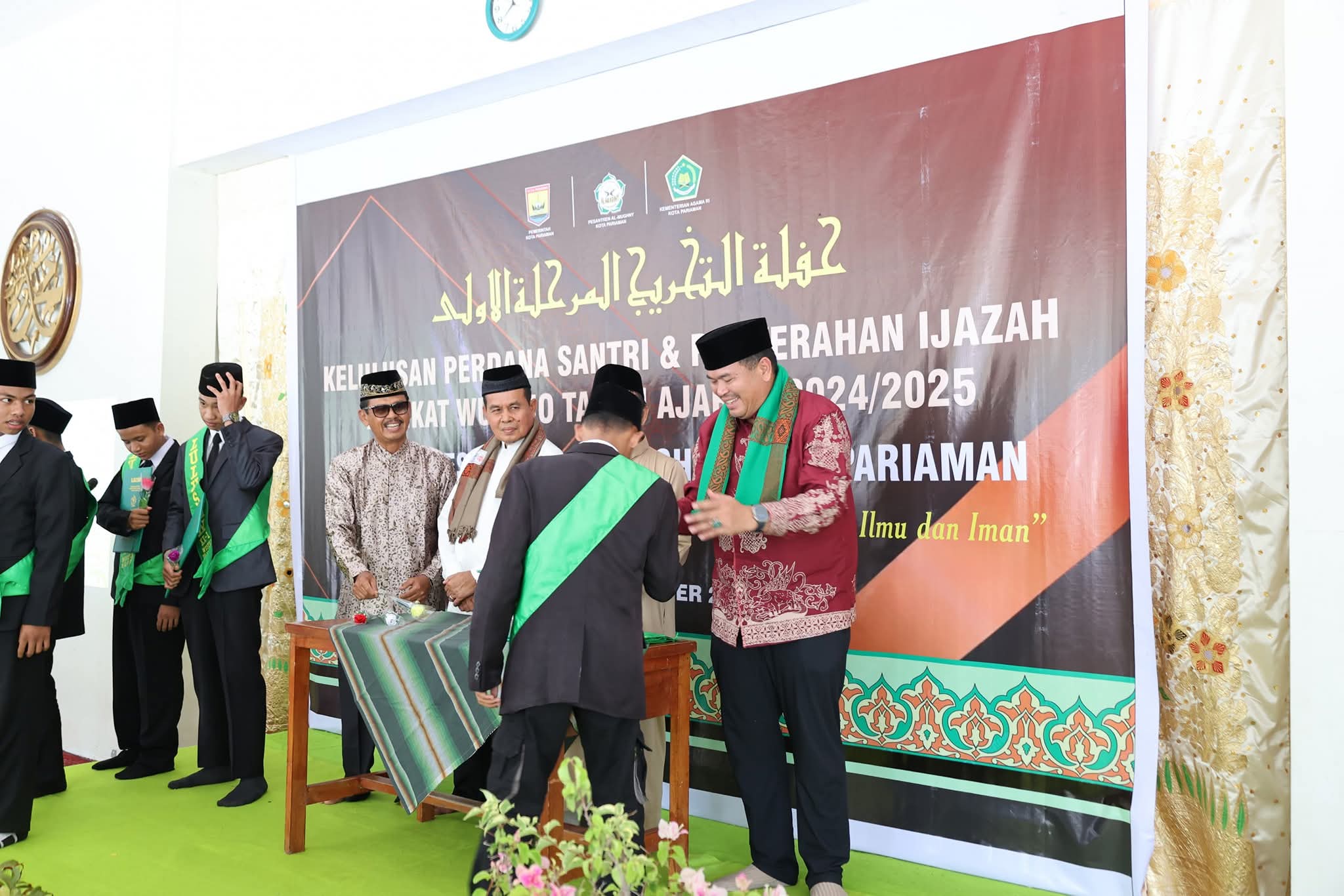 Kota Pariaman — Wali Kota Pariaman, Yota Balad yang didampingi Ketua TP PKK Kota Pariaman, Ny. Yosneli Balad menghadiri kelulusan perdana Santri Ponpes Al-Mughny dan penyerahan ijazah tingkat Wustho tahun ajaran 2024/2025 di Masjid Az-Zubaidah Pondok Pesantren Al-Mughny, Desa Pauh Barat, Kecamatan Pariaman Tengah, Kota Pariaman, Kamis (9/10).