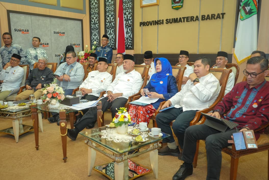 PADANG — Gubernur Sumatera Barat (Sumbar), Mahyeldi Ansharullah mengikuti rapat koordinasi (Rakor) pemulihan pascabencana hidrometeorologi di wilayah Sumatera dengan Menteri Dalam Negeri (Mendagri) RI, Tito Karnavian.