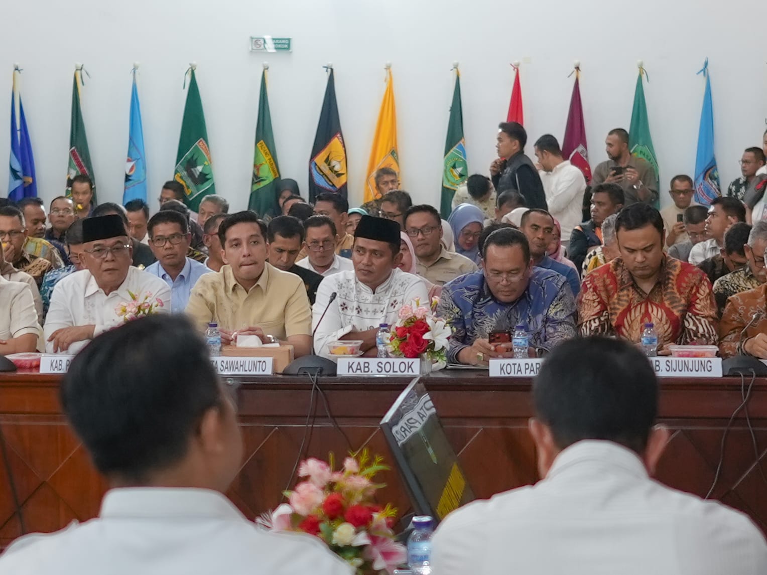 Arosuka — Bupati Solok Dr. (H.C) Jon Firman Pandu, SH didampingi oleh Kepala OPD terkait menghadiri Rapat Koordinasi Kepala Daerah mengenai penanganan infrastruktur terdampak bencana di Sumatera Barat, yang digelar di Auditorium Gubernur Sumbar, Kota Padang, Jumat malam (28/1). Rapat tersebut dihadiri oleh Wakil Ketua Komisi VI DPR RI Andre Rosiade, Gubernur Sumatera Barat Mahyeldi, serta Kepala Daerah se-Sumatera Barat.