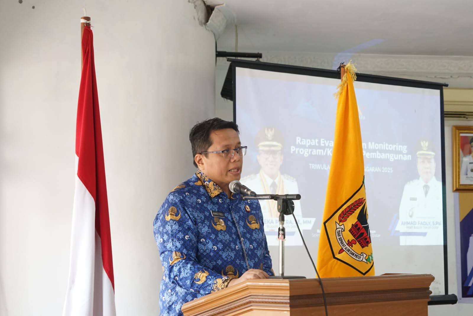 Tanah Datar – Wakil Bupati Ahmad Fadly memimpin rapat monitoring dan evaluasi (Monev) kegiatan pembangunan pada kondisi triwulan II tahun anggaran 2025 di aula Kantor Bupati, Pagaruyung, Kamis (17/7).