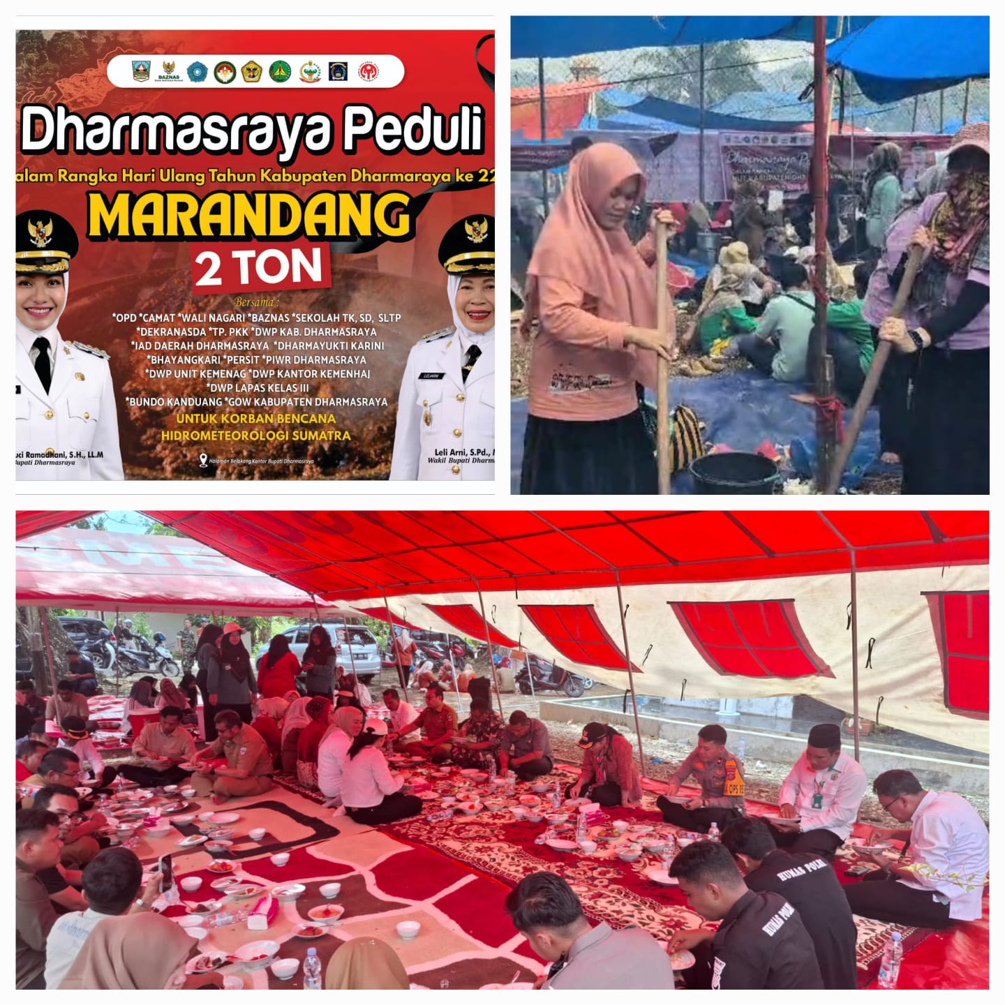 Sejak pagi, 52 nagari dengan 11 kecamatan yang tergabung dalam OPD , organisasi wanita dan Forkopimda Dharmasraya tampak menyatu dengan masyarakat. Pejabat, aparat, relawan, hingga ibu-ibu pengolah rendang berdiri sejajar di 134 kancah. Satu kancah (kuali) 15 kilo gram daging sapi .Tak ada sekat formal, mereka semua larut dalam kerja kolektif yang menuntut ketelatenan dan kesabaran , tapi dua hal yang juga diuji selama hampir sebulan bencana melanda.