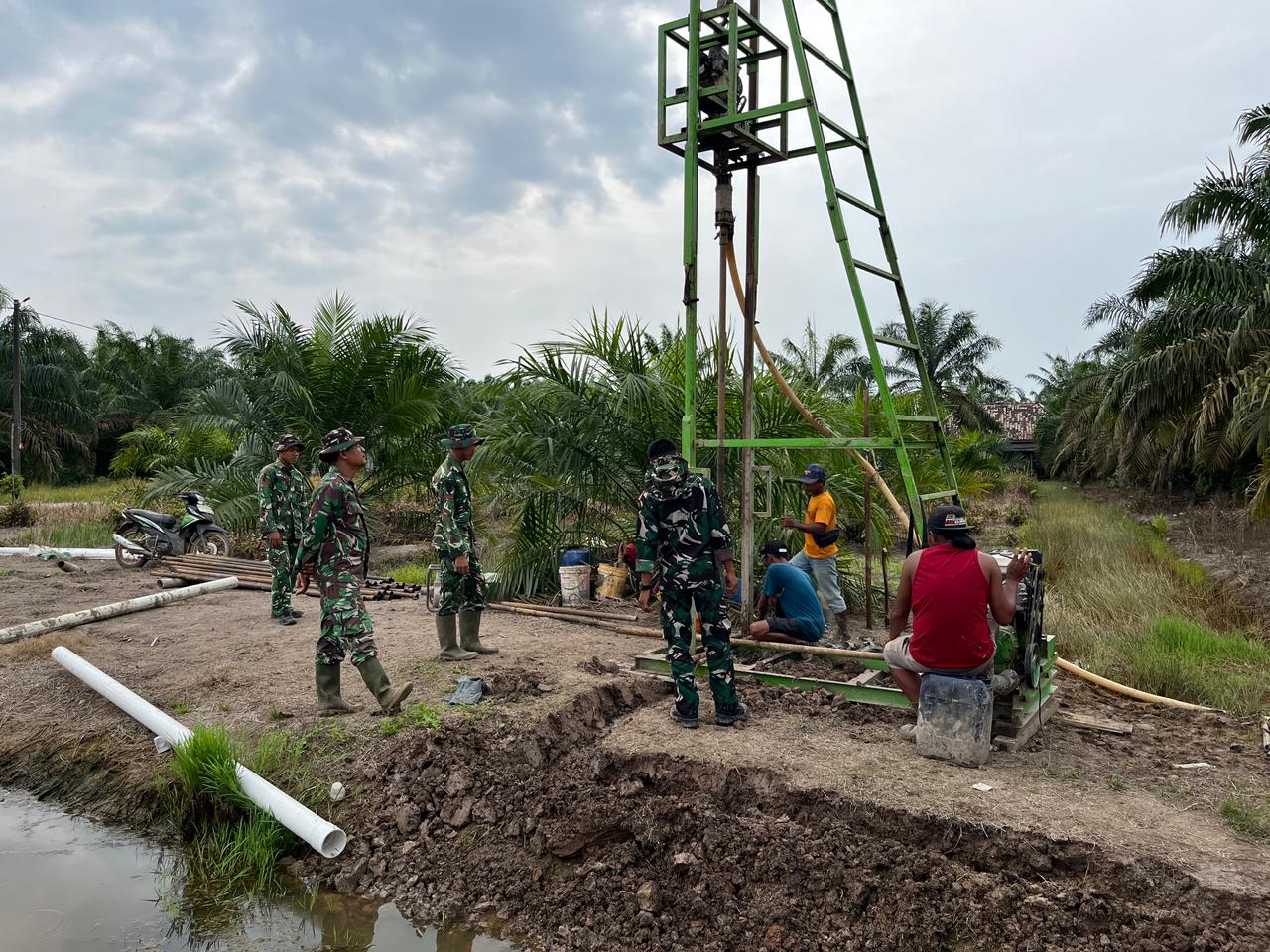 BANYUASIN – Anggota Satgas TMMD ke-127 dari Kodim 0430/Banyuasin terus berupaya keras mengejar target pembangunan sumur bor di titik ketiga yang berlokasi di belakang Kantor Desa Wonosari, Kecamatan Pulau Rimau. Pengerjaan ini merupakan salah satu sasaran prioritas dalam program TMMD yang bertujuan meningkatkan akses air bersih bagi masyarakat desa. Rabu (4/3).