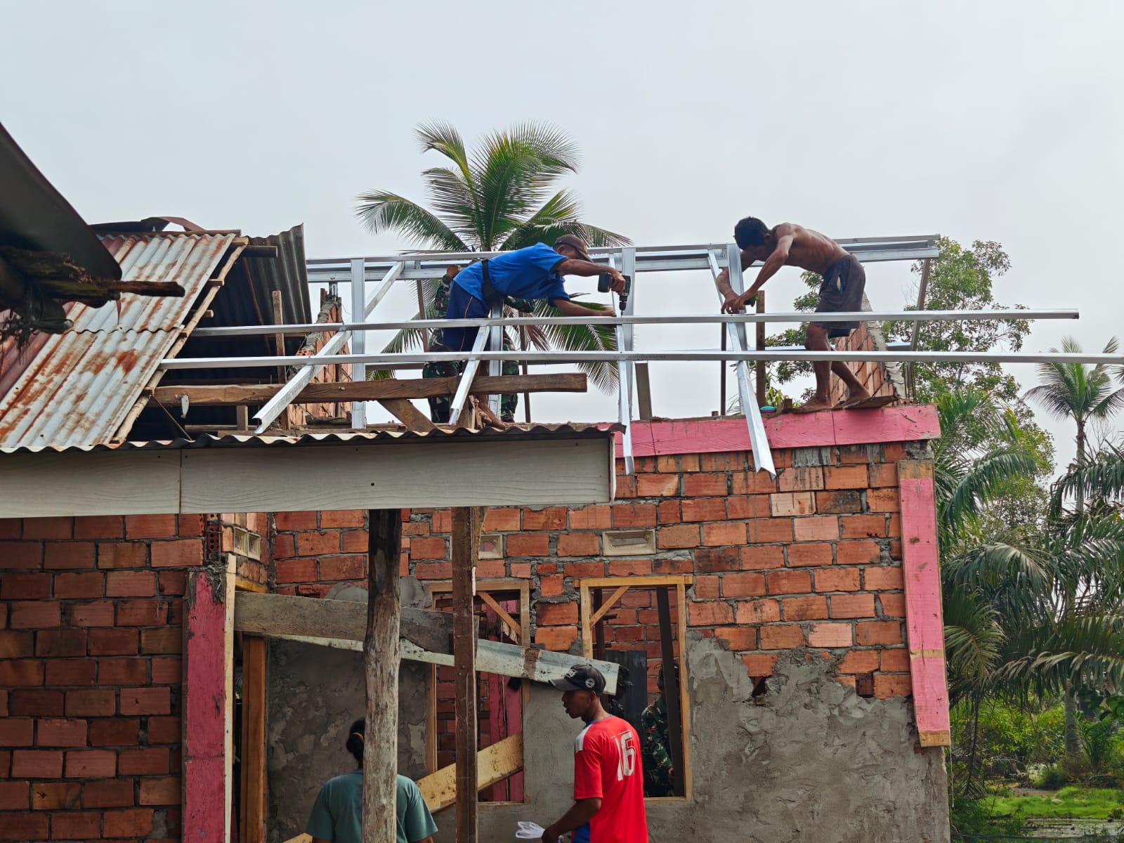 Pemasangan rangka baja telah selesai dilakukan, dan saat ini anggota Satgas TMMD dan masyarakat tengah fokus pada plester dinding bagian dalam dan luar rumah.