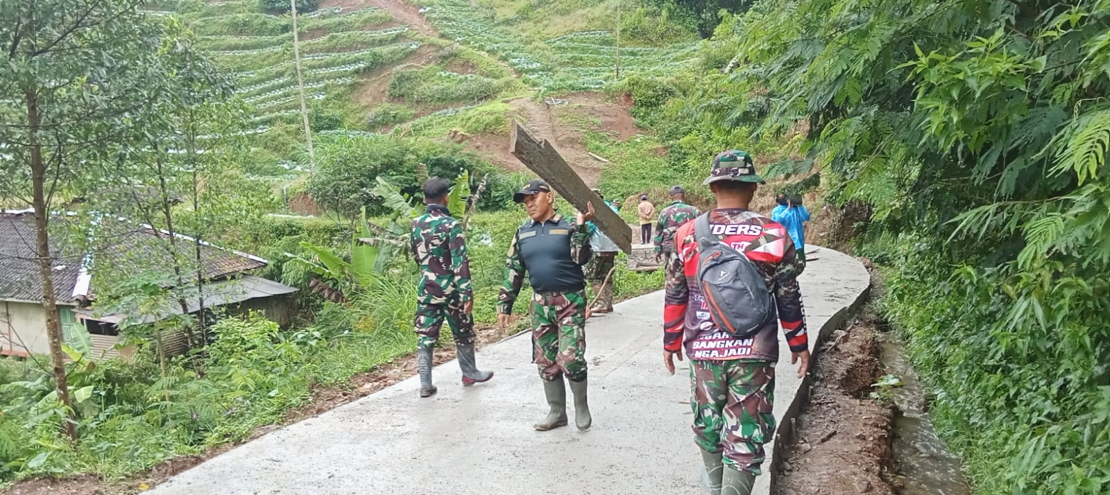 BANDUNG – Anggota Satuan Tugas TNI Manunggal Membangun Desa (TMMD) Reguler Ke-127 Kodim 0624/Kabupaten Bandung bekerja sama dengan masyarakat Desa Cipelah, Kecamatan Rancabali, Kabupaten Bandung, melaksanakan kegiatan pembersihan papan bekisting dan persiapan pembuatan tugu simbol TMMD pada hari Jumat, 06 Maret 2026, mulai pukul 08.00 WIB hingga selesai. Kegiatan yang berlangsung di Kampung Simpang Babakan Garut ini dilakukan setelah proses pengecoran jalan di lokasi tersebut selesai dan permukaan jalan mulai mengering.