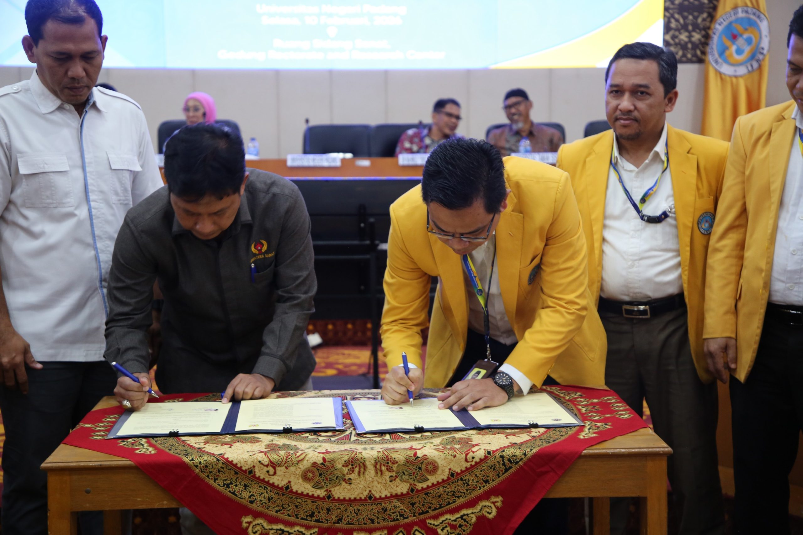 Ruang Sidang Senat Universitas Negeri Padang (UNP) yang biasanya hening, pada Selasa (10/2) Justru dipadati semangat kolaborasi. Enam lembaga mitra, yakni PT. Bank Muamalat Indonesia, UIN Mahmud Yunus Batusangkar, Universitas Bung Hatta, Universitas Taman Siswa, KONI Sumatera Barat, dan Pemerintah Kabupaten Dharmasraya, hadir untuk menandatangani nota kesepahaman dengan UNP.